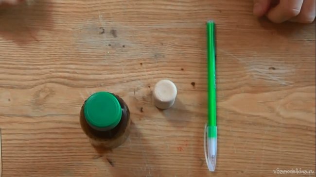 обычная шариковая ручка, винная пробка и стеклянная баночка небольшого размера, в которую и будет помещена краска.