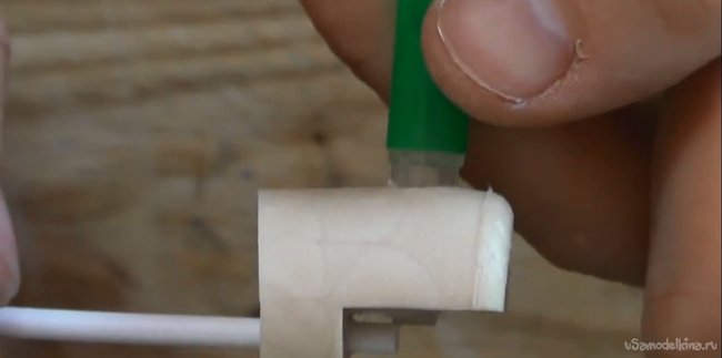Когда уголок вырезан, необходимо проделать дырку посередине пробки так, чтобы через нее проходил стержень от шариковой ручки. Также нужно сделать отдельный проход на боковой части пробочки так, чтобы через него проходила нижняя часть шариковой ручки.