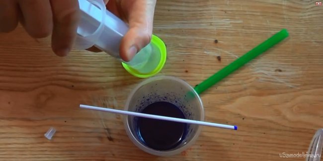 Для сборки такого прибора потребуются следующие детали: одноразовый шприц с иглой, изолента либо скотч, скрепка, нитка и емкость для красящего вещества.