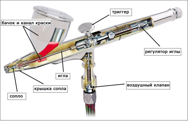 Краска хранится в бачке, расположенном сверху, снизу или сбоку, в зависимости от типа аэрографа. Она идёт через канал к игле и останавливается в месте, где игла плотно прилегает к выпускному отверстию. Попадание краски в часть аэрографа, где она не должна быть, предотвращается уплотнителем иглы. Когда Вы нажимаете на триггер, воздушный клапан открывается и пускает воздух, который проходит через свой выделенный канал, после чего выходит из сопла. Движение иглы вперёд и назад изменяет зазор выпускного отверстия сопла, что регулирует количество распыляемой краски. В зависимости от типа аэрографа, игла может двигаться отведением триггера назад в процессе распыления, либо только регулятором на задней чести аэрографа, который настраивается до распыления. Типы аэрографов и особенности их конструкции мы рассмотрим в этой статье ниже.