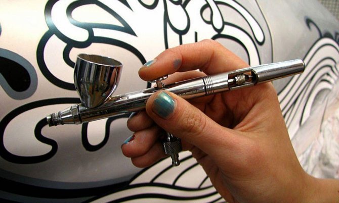 Самое важное приспособление для аэрографии, это сам аэрограф. Он продается в магазинах для творчества. Лучше брать аэрограф универсальный для формирования тонких линий, у которого толщина сопла составляет 0,3 мм.