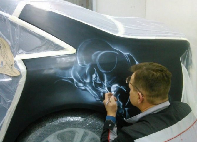 - Монохромная аэрография. Вся работа на авто выполняется одним цветом. Периодически используется белый цвет, который добавляется к нему для получения разных оттенков. Монохромный способ оптимален для новичков, которые хотят выполнить такую работу своими руками в домашних условиях.