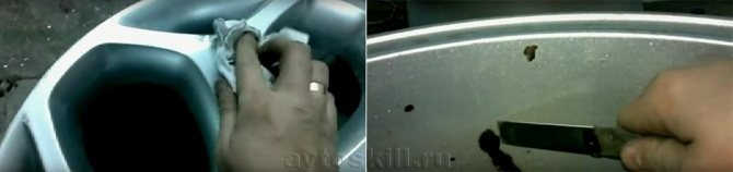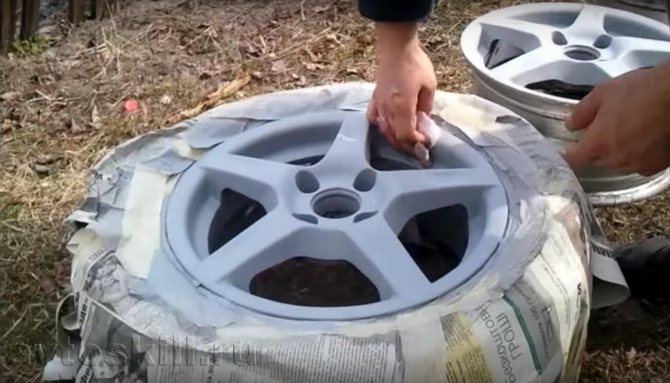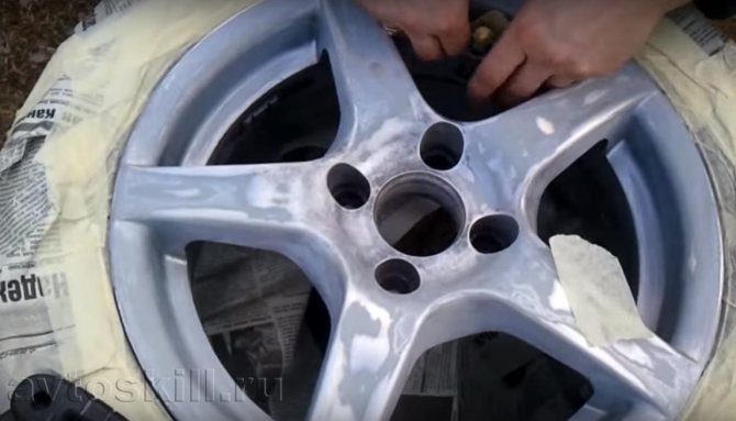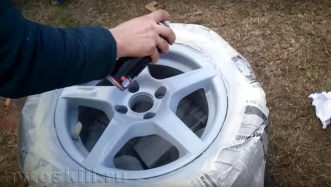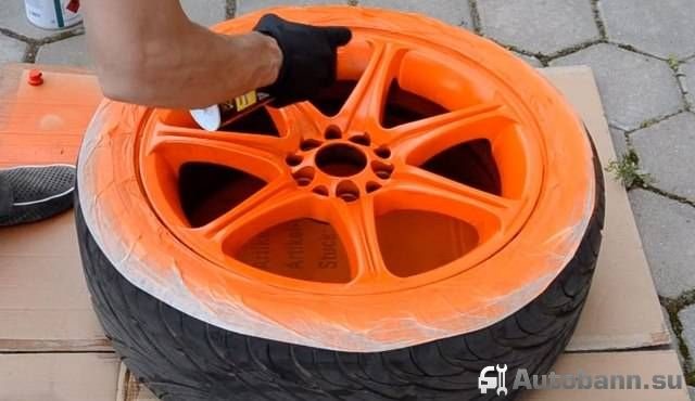 Для начала колеса машины нужно вымыть, с них стандартно снимают покрышки. Многие автомобилисты не хотят этого делать и поэтому интересуются, можно ли красить, не снимая резину. Теоретически возможно, но тогда ее придется заклеивать малярным скотчем или другим аналогичным материалом, от которого впоследствии легко избавиться.