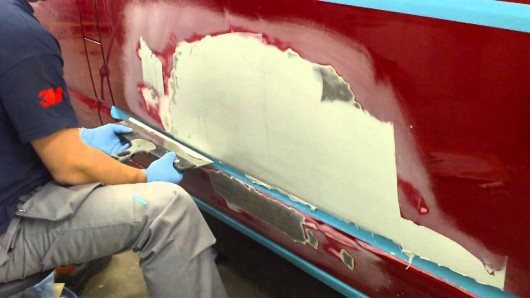 - Если на кузове имеются дефекты, вмятины или царапины, для устранения примените шпатлевку. Наносите ее тоненьким слоем, иначе появятся трещины. Используйте полужидкий состав и краскопульт. После высыхания, шпатлевку подчистите, используя мелкую шкурку. После повторного обезжиривания начинайте покраску.