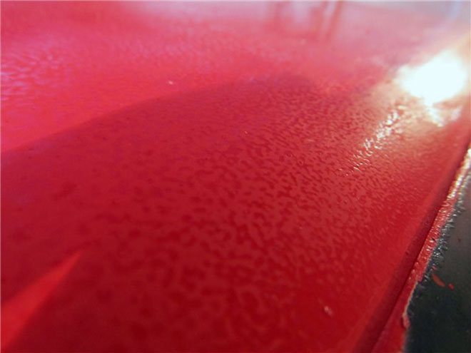 - Эффект «апельсиновой корки» (шагрень). Возникает при использовании некачественной или густой автоэмали, при нанесении пистолетом с неправильно подобранным соплом или при низком давлении.