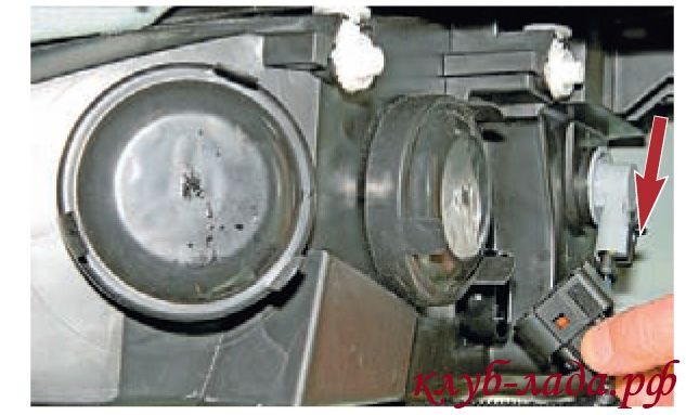 Чтобы снять фару Калины нажимаем на фиксаторы и отсоединяем колодки проводов от: