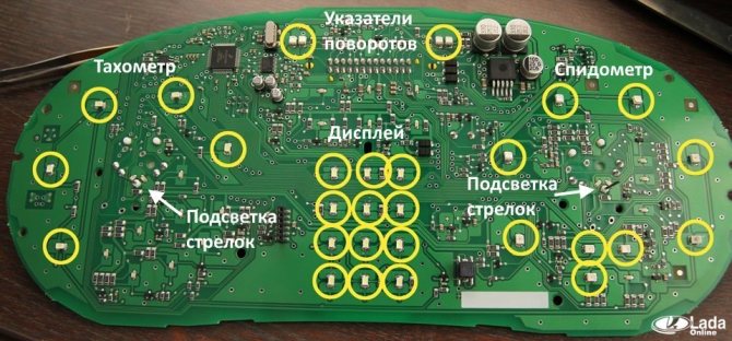 Потребуется: снять и разобрать комбинацию приборов, SMD светодиоды (выпаять из LED-ленты или светодиодной лампы), паяльник.