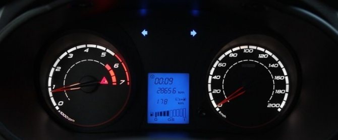 - Тахометр. Это электронный прибор, показывающий частоту вращения коленчатого вала силового агрегата. На шкале красным цветом обозначена опасная для двигателя зона работы. Не давайте двигателю работать на столь высоких оборотах для предотвращения преждевременного выхода его из строя.
