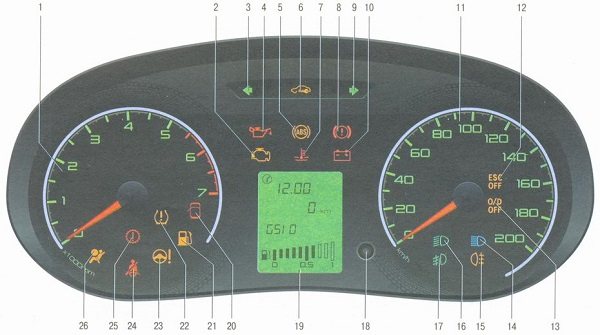 Электронная комбинация приборов выполняет функцию отображения всех необходимых водителю параметров автомобиля. В комбинации приборов объединились все контрольно-измерительные приборы – лампы подсветки, контрольные лампы, указатели уровня и температуры охлаждающей жидкости, указатель уровня топлива, спидометр, тахометр, часы, термометр, счетчик общего и суточного пробега автомобиля.