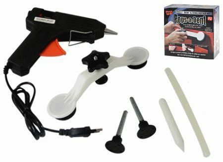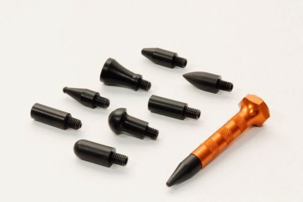 Такое название носит специализированный комплект инструментов, предназначенный для выравнивания вмятин. В него входят насадки, пластиковая скоба клей, а ремонт проводится так: