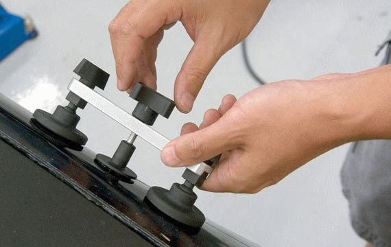 - Клеевой аппликатор, приспособление крепится к кузову автомобиля при помощи клея. После высыхания клеящего состава, специалист слегка тянет аппликатор в свою сторону, тем самым выравнивая залом кузова.