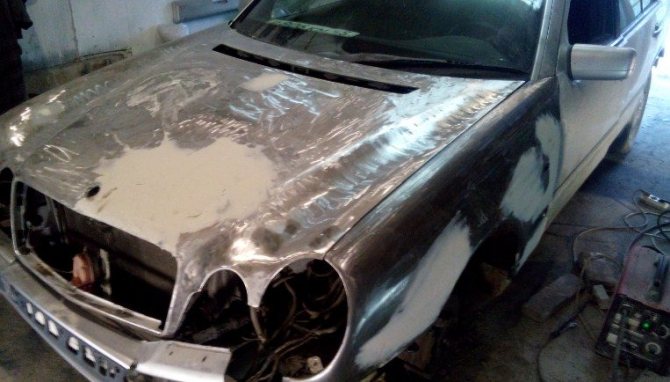 - Перед шпаклеванием поверхность кузова обязательно обезжиривается, что необходимо для последующего нанесения ровного слоя краски
