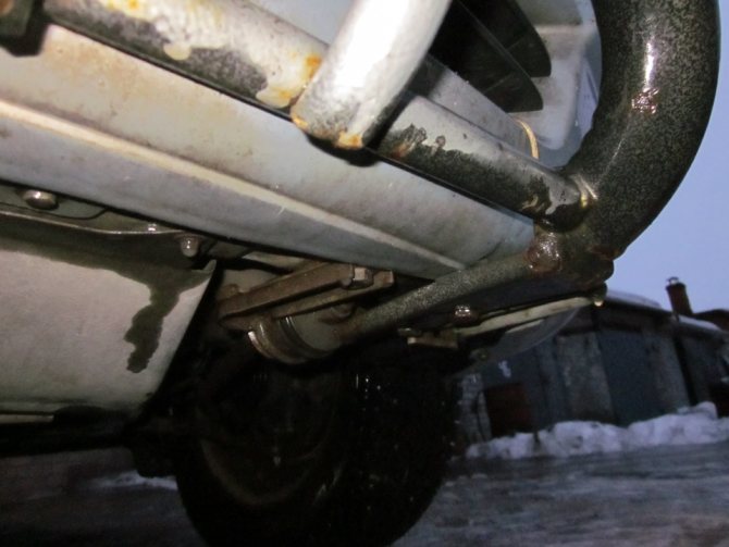 - Дуга с решеткой, расположенной внизу, и дополнительно смонтированной поперечной трубой. Такая конструкция выдерживает серьезные удары и защищает картер двигателя.
