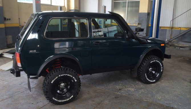 - Очень часто проводится установка колесных дисков большого диаметра. При этом отметим, что для создания автомобиля высокой проходимости устанавливают покрышки с большим протектором. Если Нива не будет эксплуатироваться по бездорожью, то устанавливаются диски с низкопрофильной резиной.