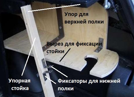 Можно предусмотреть на задней центральной части какие-либо фиксаторы, если известно, как она будет чаще всего использоваться. Даже выдвижным столиком можно дополнить эту конструкцию. Боковины тоже можно использовать не по назначению — сделать полку в багажнике с ними, только и всего, немного отсрочить во времени принятие решения о диаметре колонок, рациональности их установки. Потом можно будет завершить начатое дело, купить и подключить их, переделать существующую конструкцию.
