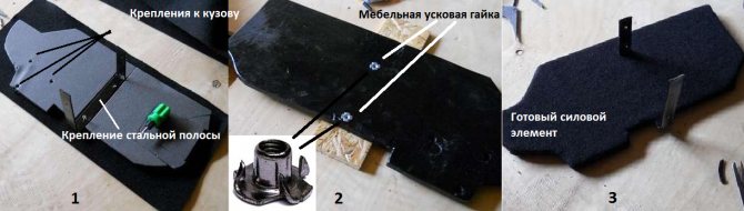 После этого устанавливаем боковины на место, крепим по штатным местам и снизу к кузову и начинаем изготовление средней вставки полки