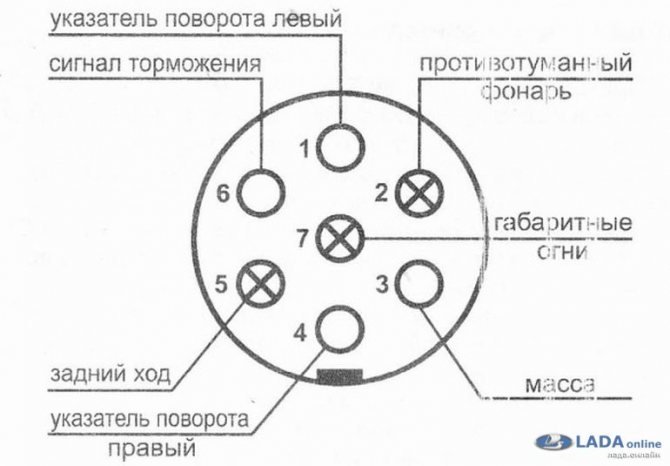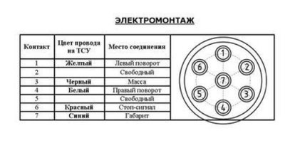 Схема подключения проста. Через первый контакт подключается левый поворотник, через четвёртый – правый поворотник. Через третий контакт подключается масса, через шестой – стоп-сигнал. Габаритные они подключается через седьмой контакт, противотуманная фара – через второй контакт (может оставаться свободным). Пятый остаётся резервом – через него может питаться дополнительное оборудование (например, установленная в прицепе перевозная автомобильная камера).