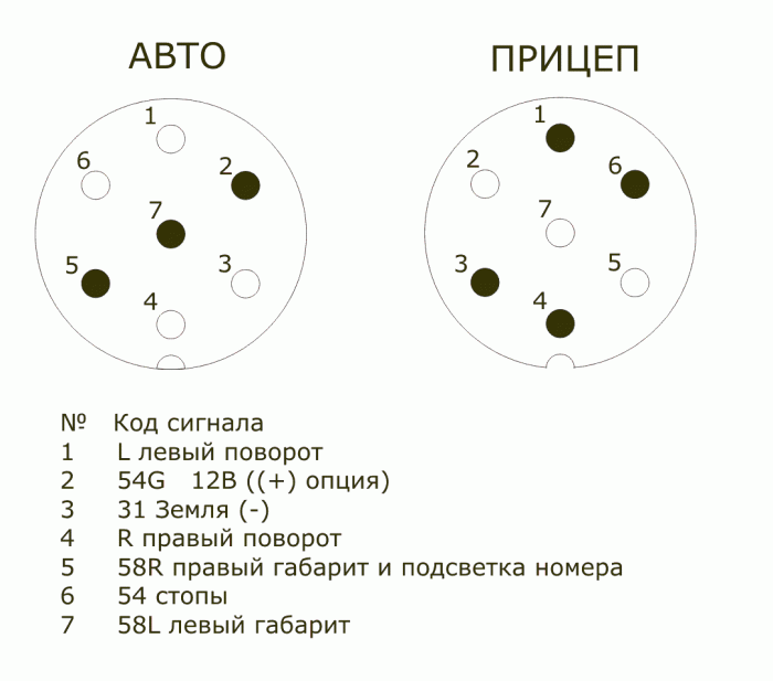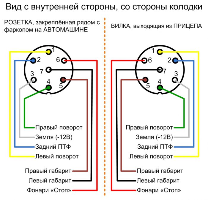 Определение: Распиновка розетки прицепа – это схема разъемов, необходимая для соединения автомобиля с прицепом своими руками. Подключение электрики требуется, чтобы на прицепе работала вся осветительная техника, согласно правил дорожного движения.