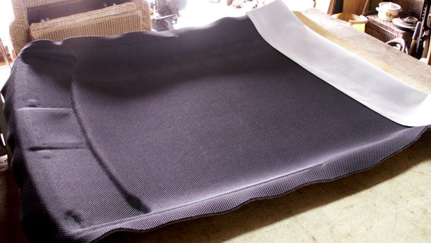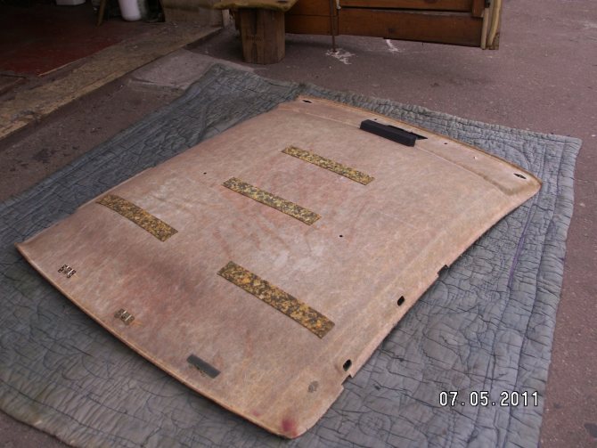 Далее начинается обтяжка потолка автомобиля. Клей наносят по центру полосой длиной 10 см. К ней следует приклеить центральную часть фрагмента материала. Клеить продолжают в стороны, нанося полосы клея через 10 см. В процессе работ нужно следить за изгибами рабочей поверхности. Следует приклеить ткань как можно более прочно, чтобы в дальнейшем потолок не провис. При этом изгибы и углубления являются местами, требующими особого внимания. Один натягивает ткань, а другой разглаживает ее. Края материала нужно подвернуть и приклеить к обратной стороне, а излишки обрезают. Напоследок надо сделать отверстия для болтов дополнительных элементов. После этого устанавливают потолок в салон.
