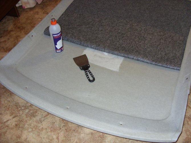 - Поверх приклеенной ткани, которая не совпадает по цвету с салоном, приклеиваются собранные ранее волокна. Такую процедуру лучше повторить несколько раз, используя больше волокон и небольшое количество клея.