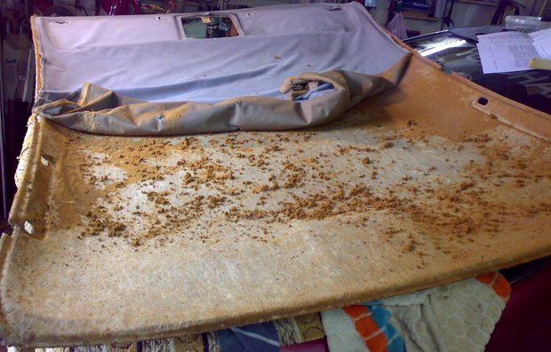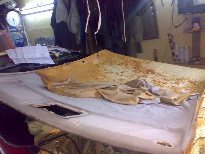2. Каркас потолка моей машины пердставляет собой матрицу, на которую был напылен стекломат, после чего была нанесена “эпоксидка”. Сдираю остатки велюра и поролона и подготавливаю поверхность под выклейку нового.