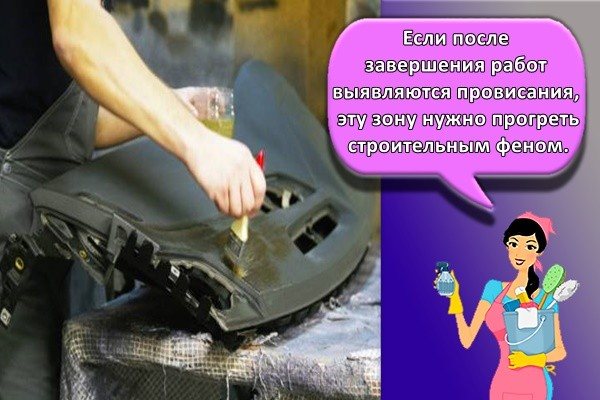 Если после завершения работ выявляются провисания, эту зону нужно прогреть строительным феном. В ином случае потребуется новая перетяжка. Также следует учитывать, что в старых автомобилях возможно подтекание крыши. Поэтому до начала работ необходимо проверить герметичность кузова и устранить выявленные дефекты.