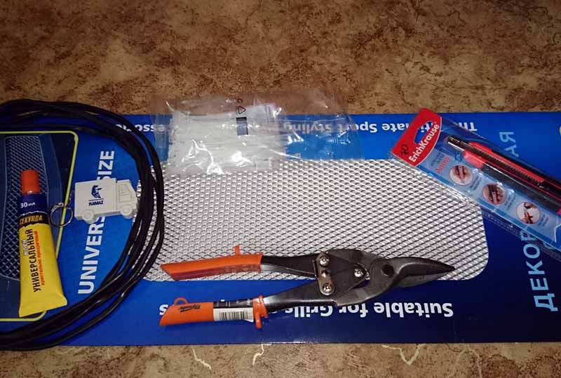 Самым распространенным материалом, заменяющим стандартную заводскую решетку радиатора, представляется решетка рабица с мелкой ячейкой. Это могут быть изделия из алюминия, пластика и даже стали. Найти такой товар можно во многих местах, и стоить он будет очень скромные деньги. Также для операции по пересадке решетки потребуется следующий инвентарь и средства: