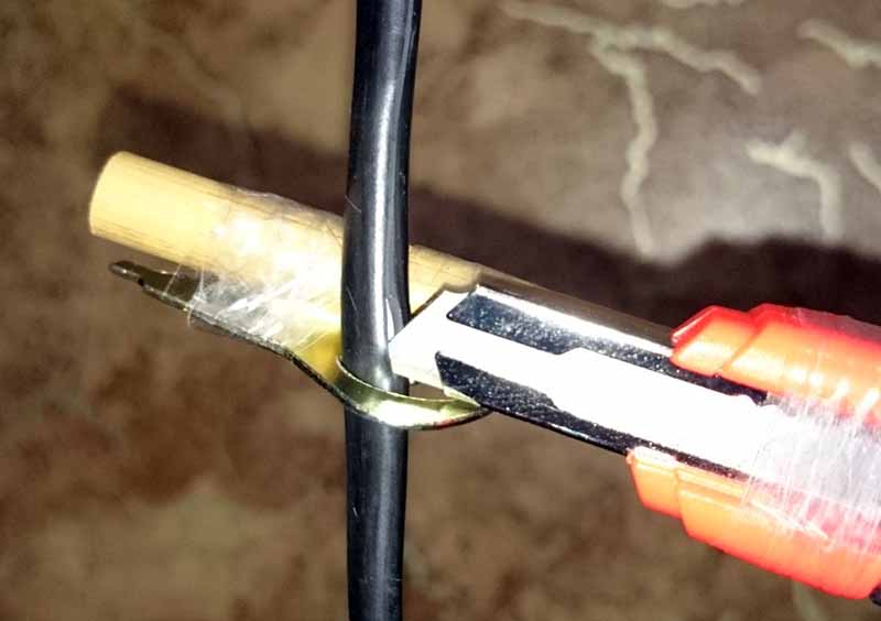 - Примотайте канцелярский нож к деревянной планке, как показано на фото. С помощью этого инструмента сделайте продольный разрез кабельной изоляции и вытащите изнутри все проводники.