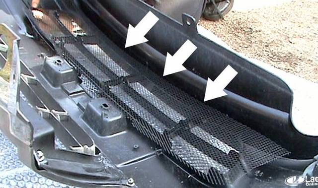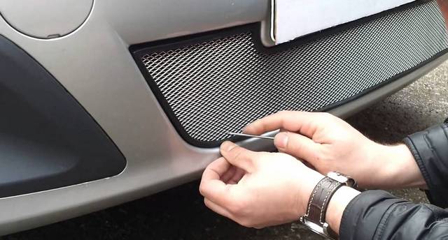 Для того чтобы установить сетку на решётку радиатора, необходимо предварительно вырезать её по размерам старой рамки. Крепёж следует осуществить с помощью небольших болтов или саморезов, подойдут также и пластиковые хомуты. Если выбор останавливать на саморезах, то перед вкручиванием их следует прогреть на огне, что не вызовет возможного растрескивания используемого материала. Сетку из пластика лучше всего прикрепить с помощью клея.
