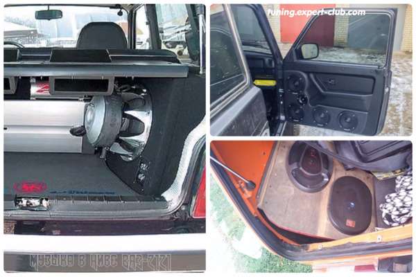 В той или иной степени без этого трудно обойтись при любом подходе к улучшению салона (начиная от аскетичных вариантов и тем более в случае серьёзных переделок). Автозвук и мультимедиа в Ниве — это реально, хоть и в некоторых случаях крайне неактуально, с учётом особенностей внедорожной эксплуатации. Поэтому при внутреннем тюнинге в любом случае придётся столкнуться и с установкой музыки. Причём, не только непосредственно головного устройства системы, но и всех сопутствующих автозвуковых компонентов — усилителей, акустики, сабвуферов и прочих «прибамбасов». Обычно простая Нива обходится минимумом такой аппаратуры, но бывают и исключения, поражающие оригинальностью и мощностью оборудования.