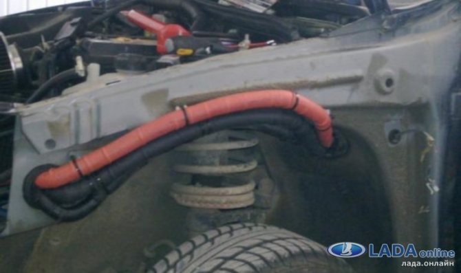 В комплекте с помимо противотуманных фар и креплений должна быть проводка, которой часто не хватает. Мы рекомендуем вам докупить несколько метров провода сечением не менее 0,75кв.мм. Провода из моторного отсека в салон протягиваем с помощью куска проволоки по правому борту через отверстие над педалью сцепления. Для получения доступа потребуется снять переднее левое колесо и подкрылок.