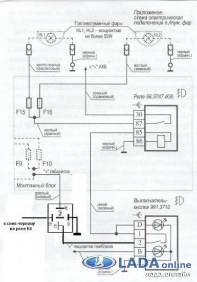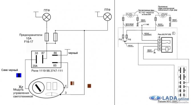 Для владельцев Лада Калина с МУС схема подключения противотуманок следующая: