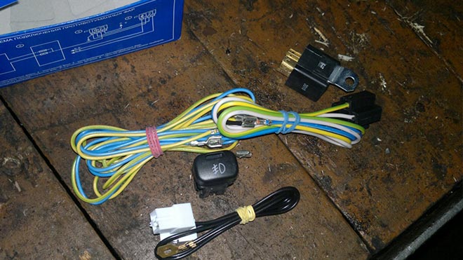 Для начала нужно приобрести набор ПТФ (2 фары + 2 рамки) и набор для установки ПТФ (реле ПТФ, кнопка включения, провода, саморезы, коннекторы и инструкция).