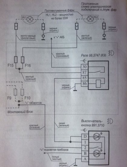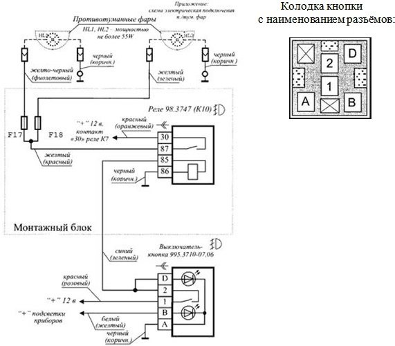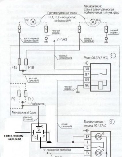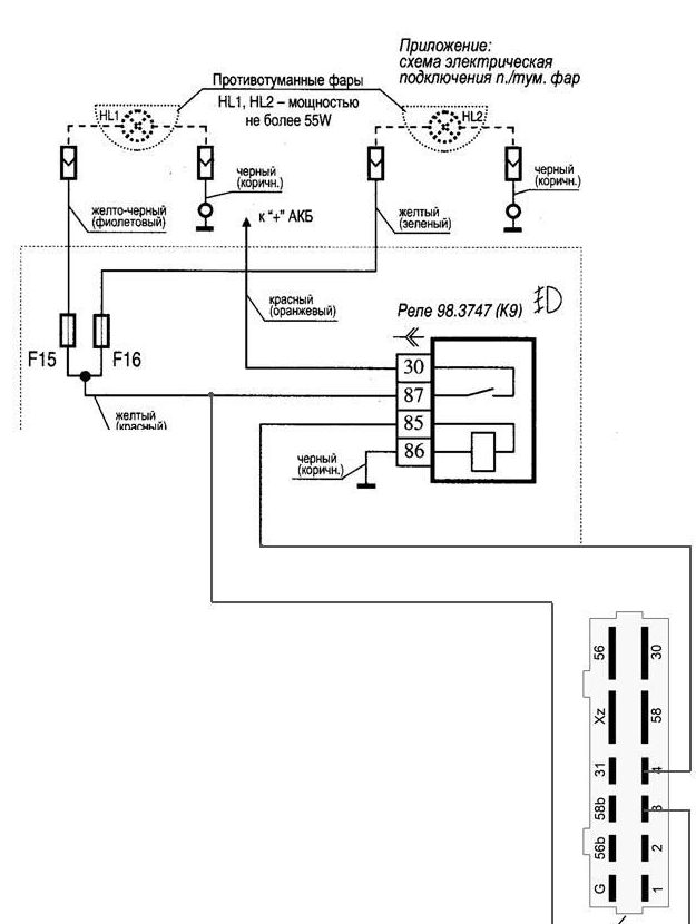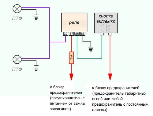 - При подключении желательно использовать предохранительное устройство на 15 ампер. К этому элементу, а также проводке от противотуманок подключаются и силовые контакты реле, они отмечены номерами 30 и 87.
