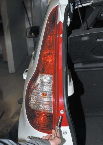 Преодолевая сопротивление двух фиксаторов фонаря, входящих в пластмассовые держатели на кузове, сдвигаем фонарь назад и отводим от кузова.