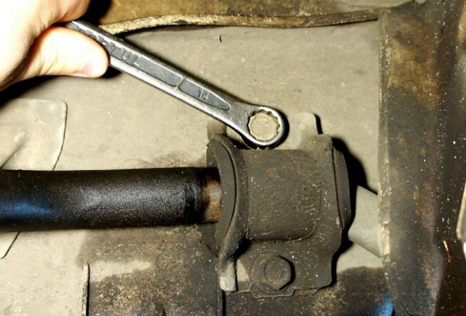 - Откручиваем болт переднего сайлентблока. Мастеру понадобиться помощь нескольких ключей на 22.