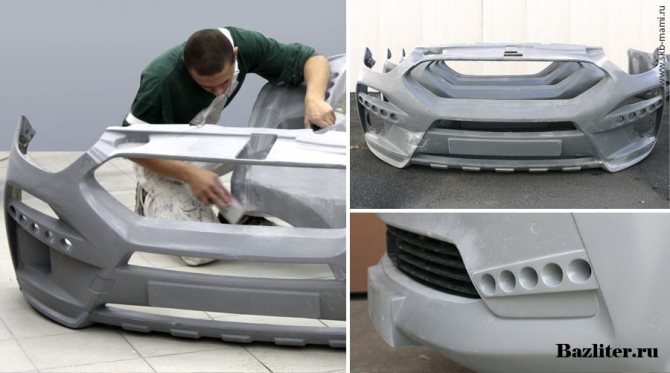 Работать с пенопластовым обвесом можно сразу. Покройте его шпатлевкой или техническим пластилином. Дождитесь высыхания и обработайте наждачкой. Нанесите стекловолокно и смолу. После полного затвердевания конструкции отшлифуйте ее и покройте краской в цвет автомобиля. О том, как правильно красить бампер можно прочесть здесь.