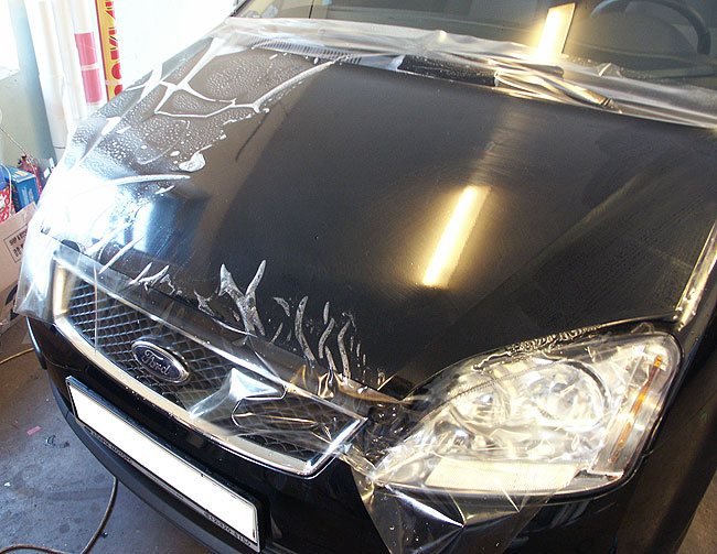 , который одевается на капот. В народе его называют «намордник». Однако, у него есть существенный недостаток. Под чехол попадает песок, пыль и мелкая грязь, а это приводит к помутнению окраски.